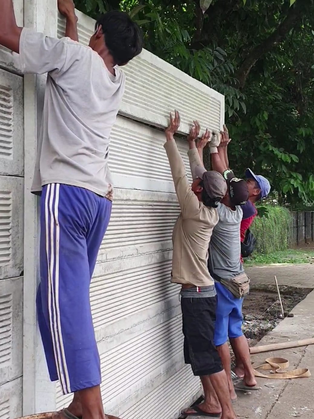 Letakkan panel beton pada posisi tiang yang sudah disiapkan. Pastikan posisi panel sejajar dengan garis pemasangan yang sudah ditentukan sebelumnya.