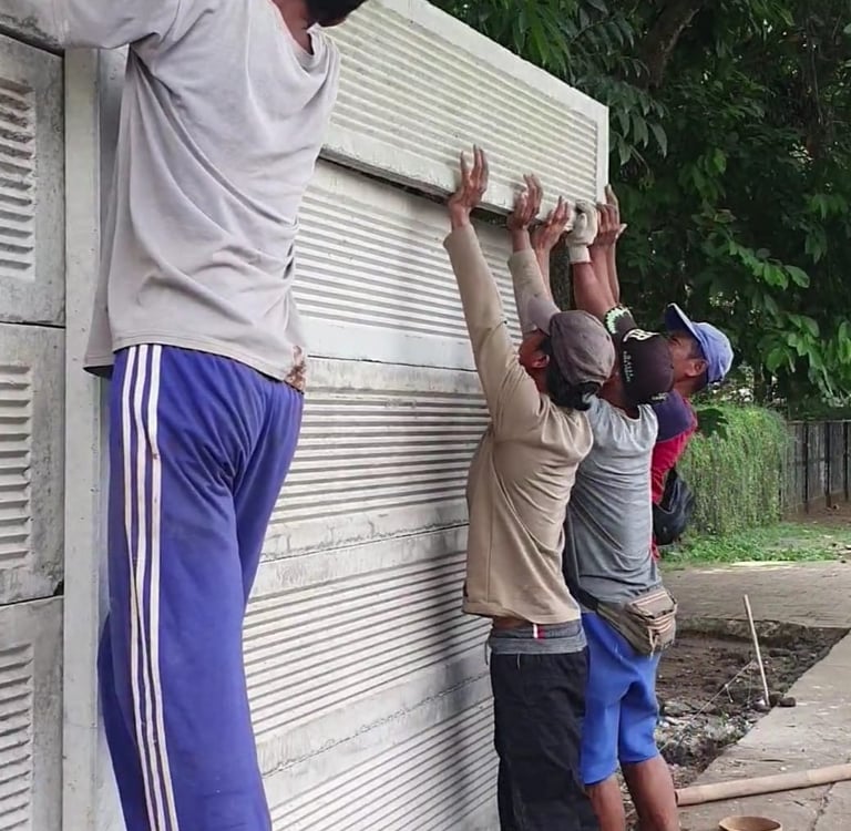 Setelah tiang terpasang dan beton telah mengeras, saatnya untuk memasang panel beton pada tiang. Panel beton biasanya memiliki sistem penghubung yang memudahkan pemasangan, seperti lubang untuk tiang atau klip pengunci. Langkah-langkahnya sebagai berikut: